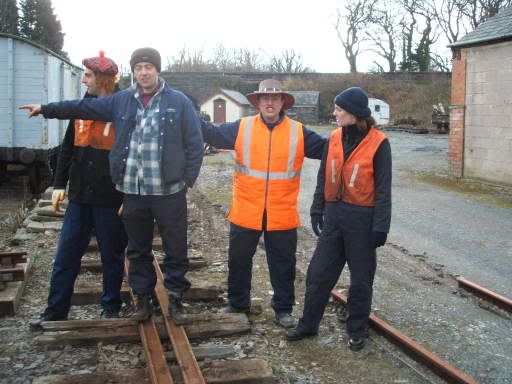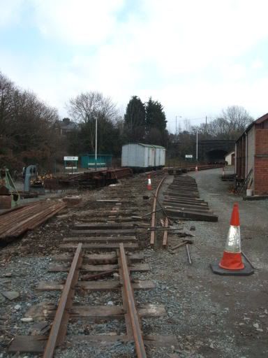 All we were basically doing was taking up old rail and laying new, right next to the bit we did last time, except this time we had far fewer people and we were only working on it for a day, so basically we only got the old rail and sleepers out the way, and about half of the new ones laid properly. Was good straightforward work, though. This is a photo from lunchtime I think…shows all the new sleepers waiting to go in (the random bricks were our best attempt to mark where they’d need to go so that we could dig holes for them).
