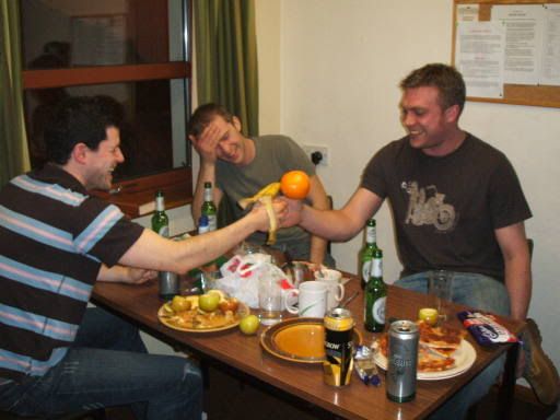 Saturday evening degenerated into utter drunken silliness, womble porn and fruit-based thumb wars as seen below. In the foreground can be seen many shot glasses lovingly crafted from apples, too. Also pizza with beer spilled on it.