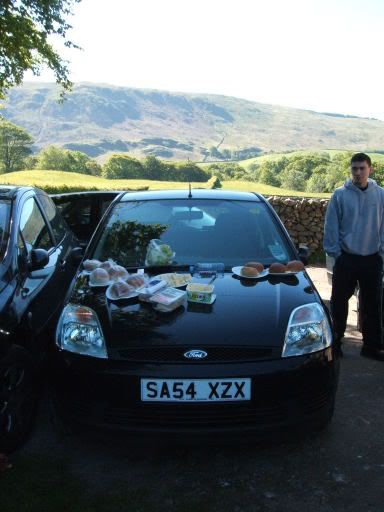 This photo has no purpose other than to show car bonnet as lunch preparation area. It just looked funny.