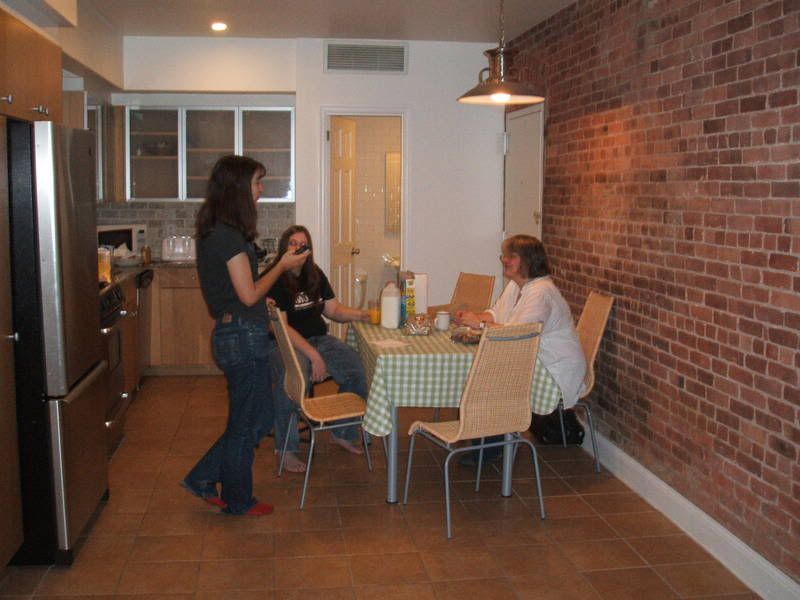 That was taken at the very end of the week, though - to get back to logical chronology, here is the kitchen area, with breakfast on the first morning – starting as we meant to go on, we all got up and showered and ate and so on in a combined total of about two hours. Not the best photo ever, but doesn’t it look like home already? Aw. Except we had nasty sweetened bread that morning. Ugh. Doesn’t go well with Marmite.