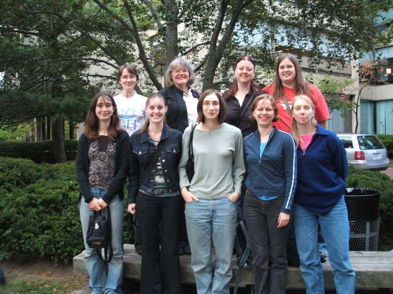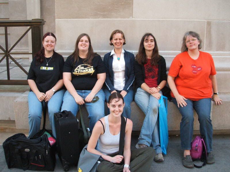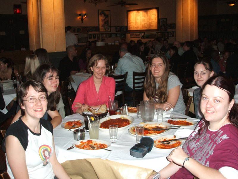 From Right to Left (I'm in an awkward mood today), with real names in brackets where people were only optional boardnames: biped, Narrisch (Dana), (top) helorime (Heather), (middle) daisy, (bottom) Keppet (Christine), me, Rian, (hiding at the back looking away because he's not with these people, oh no) Yephoe (Lars), (bottom) Q, &Co (Paul), KissTheFool (Em), Fedwren (Charity). Amy was taking the photo.