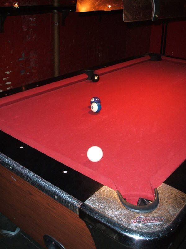 and went for a very yummy Mexican dinner, after which we accidentally ended up at the chocolate martinis place again. This was a very good night, with exceptionally bad pool playing - I had to take this shot to showcase Q's superlative skills with a cue (there were too many homophones of Q on this holiday) - the previous shot was hers, and she is trying to sink that one remaining solid colour. Hah.