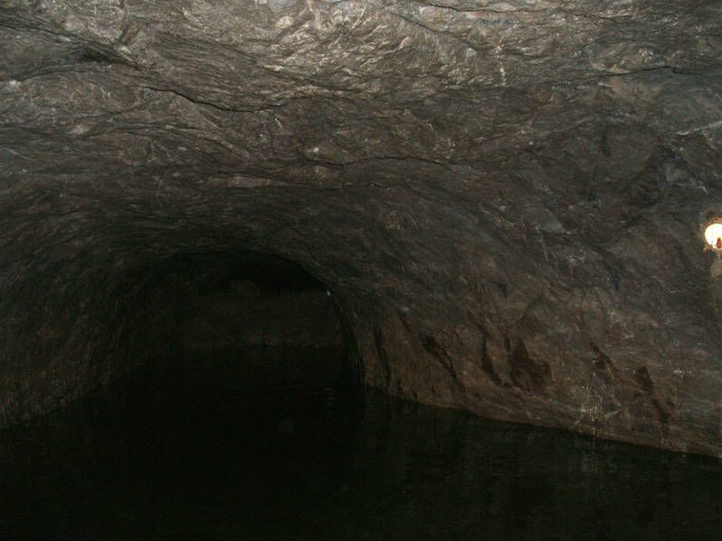 Said mine was a lead mine (ooh rhyme) in the 18th century. It was a huge failure as a mine, losing the investors the equivalent of several million pounds today. The part of it that is open to visitors now is the first tunnel they blasted (before bumping into the natural cave system and using that to make life easier) - it is only a few feet high and is kept full of flowing water to allow shallow, narrow boats to pass along it (this was true when it was a working mine too, apparently, although how you run from a blast in a boat I'm not entirely sure - I'd guess that, when doing that, you actually ran. Or splashed, anyway).