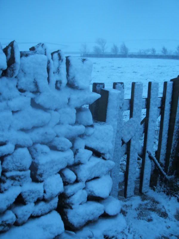 (to my camera, at least. Hey - it was having a hard day.) Of course, with snow lying as thick as this, we couldn't just drive away. Nope - we had to use the last of the light to get out and throw snowballs at each other across the road (occasionally hitting passing cars by mistake). It was great fun, except for the totally numb hands that resulted within about 2 seconds. I tried to take lots of photos, but made the surprising discovery that when the wind is blasting snow into your lens, your photos don't come out so good. My only decent one is the one I put on Flickr - but it's so pretty you can have it again.