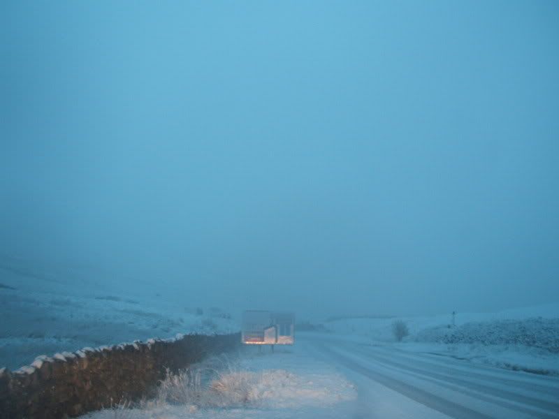 So of course we had to drive up the 1 in 5 gradient in the snow. In a Fiat Punto. Heehee. It was fun. Especially swearing at all the other motorists who didn't understand snow and insisted on dropping into first gear. By the time we got to the top of the pass (i.e. about 5 minutes later, tops), the snow had settled a bit more. The sun had also started to set, and as a result the world looked like this: